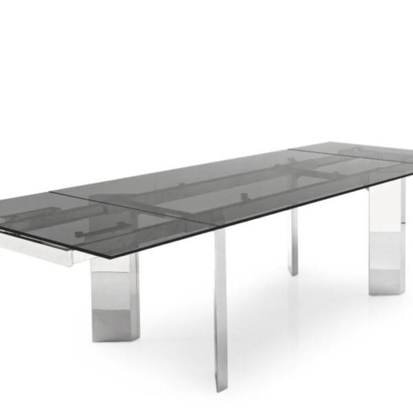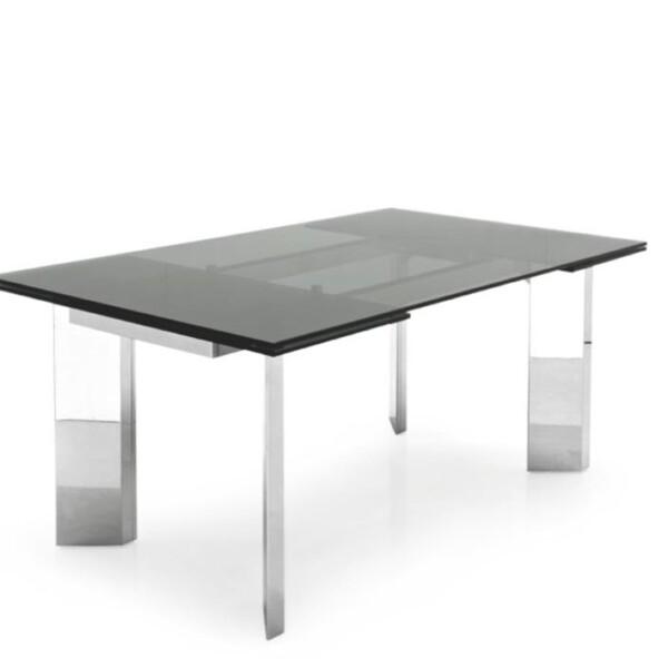 Tavolo modello Tower allungabile. Misura 180x100 estensibile a 280cm. Struttura finitura acciaio cromato, piano in vetro temperato colore nero. Presenta graffi evidenti sul piano vetro e sulla struttura.