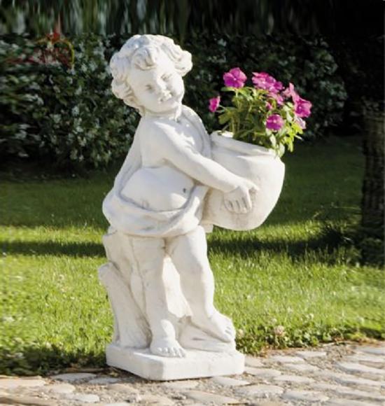 Portavaso Putto, in pietra ricostituita, Dimensioni H cm 71 Kg 38 Putto angelico in pietra ricostituita ottenuto con impasto di cemento bianco e preziosi granulati e polveri di marmo di Carrara.