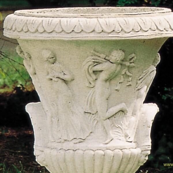 Vaso con supporto di putti, realizzato in pietra ricostituita. Prodotto in maniera artigianale colando in stampi fatti a mano cemento bianco sapientemente miscelato con preziosi granulati e polveri di marmo di Carrara.