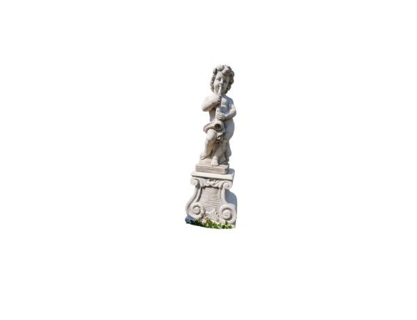 Statua di Cherubino con flauto, ottenuto con impasto di cemento bianco e preziosi granulati e polveri di marmo di Carrara.
