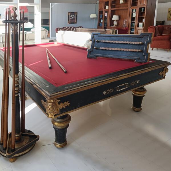 Biliardo antico - completo di 10 stecche, portastecche, tringolo, segnapunti in legno coordinato. Misure cm L315 P190 H82.