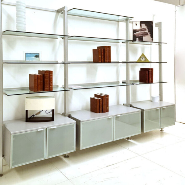 Parete Libreria con montanti in alluminio satinato con fissaggio a parete Ripiani in vetro trasparente e frontali ante in vetro opaco. Misure L263 P46 H219 cm. Graffi su montanti esterni