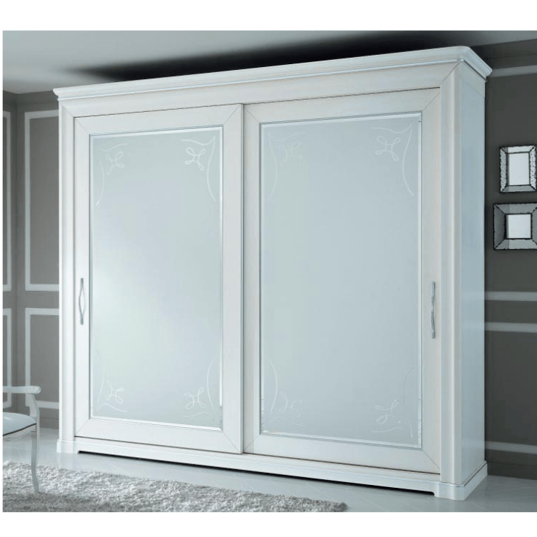 Armadio 2 ante scorrevoli. con struttura tamburata ed ante vetro satinato con decori