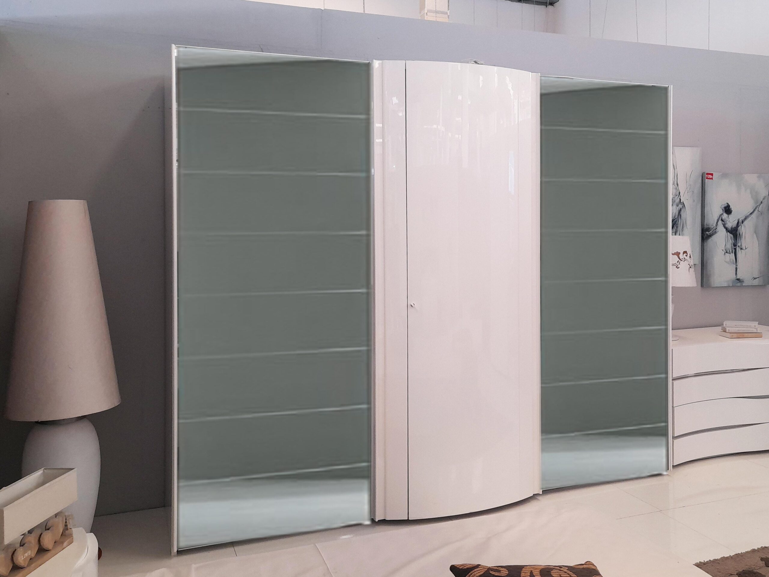 Armadio 3 ante scorrevoli, laccato bianco lucido con anta centrale curva e ante laterali specchio fumè.