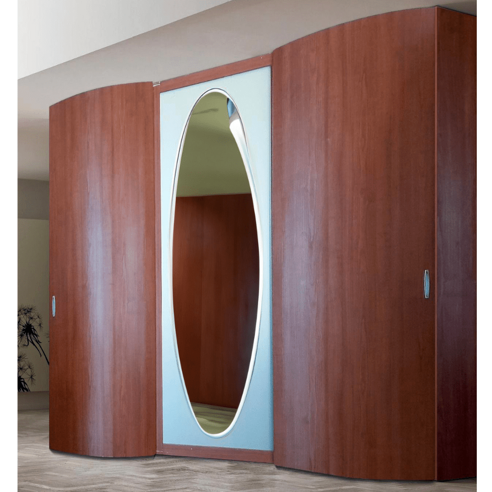 Armadio 3 ante scorrevoli, con anta centrale specchio ed ante laterali curve in finitura ciliegio.
