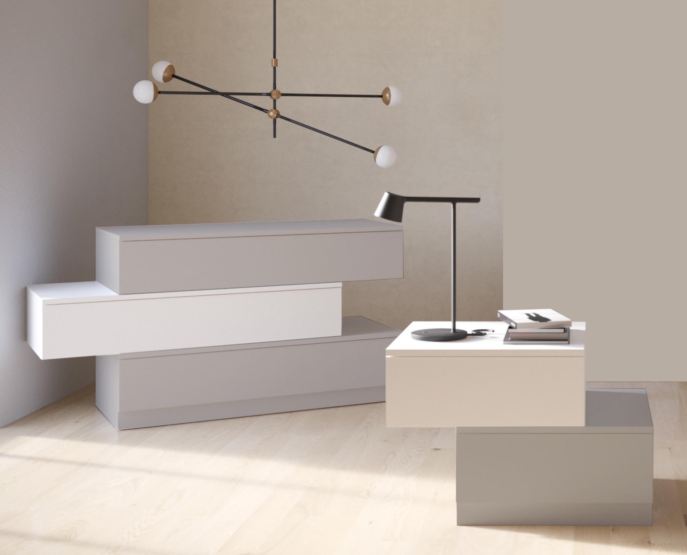 Gruppo Bridge con struttura e frontali laccati bianco e grigio opaco con apertura Push Pull,