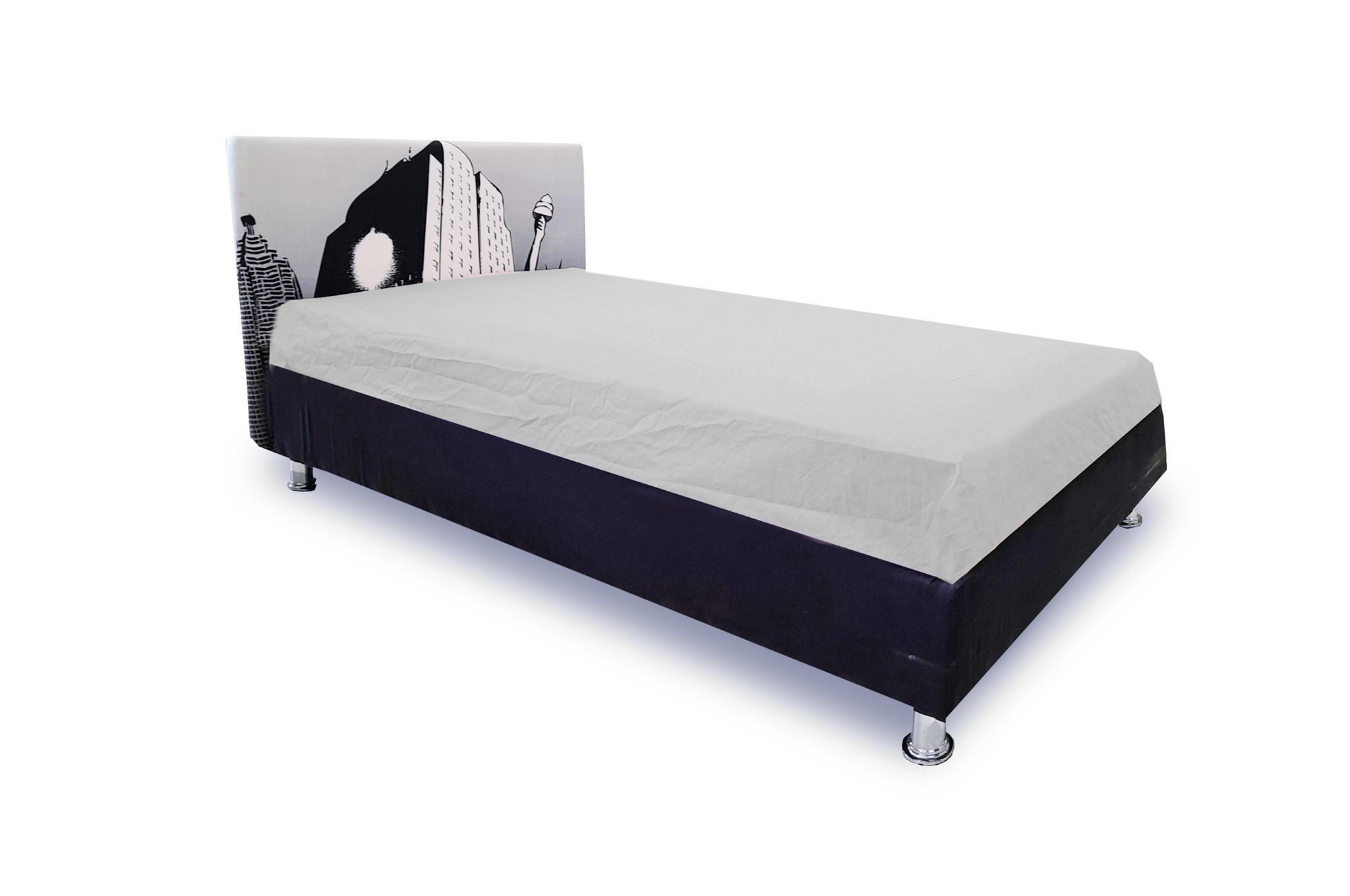 Letto singolo rivestito in tessuto.