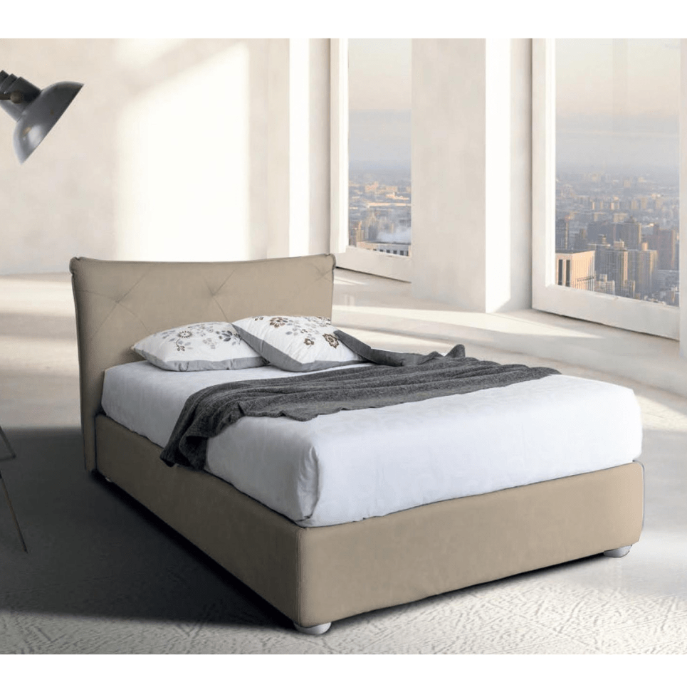 Letto 1 piazza e mezza in tessuto rigato beige con contenitore.