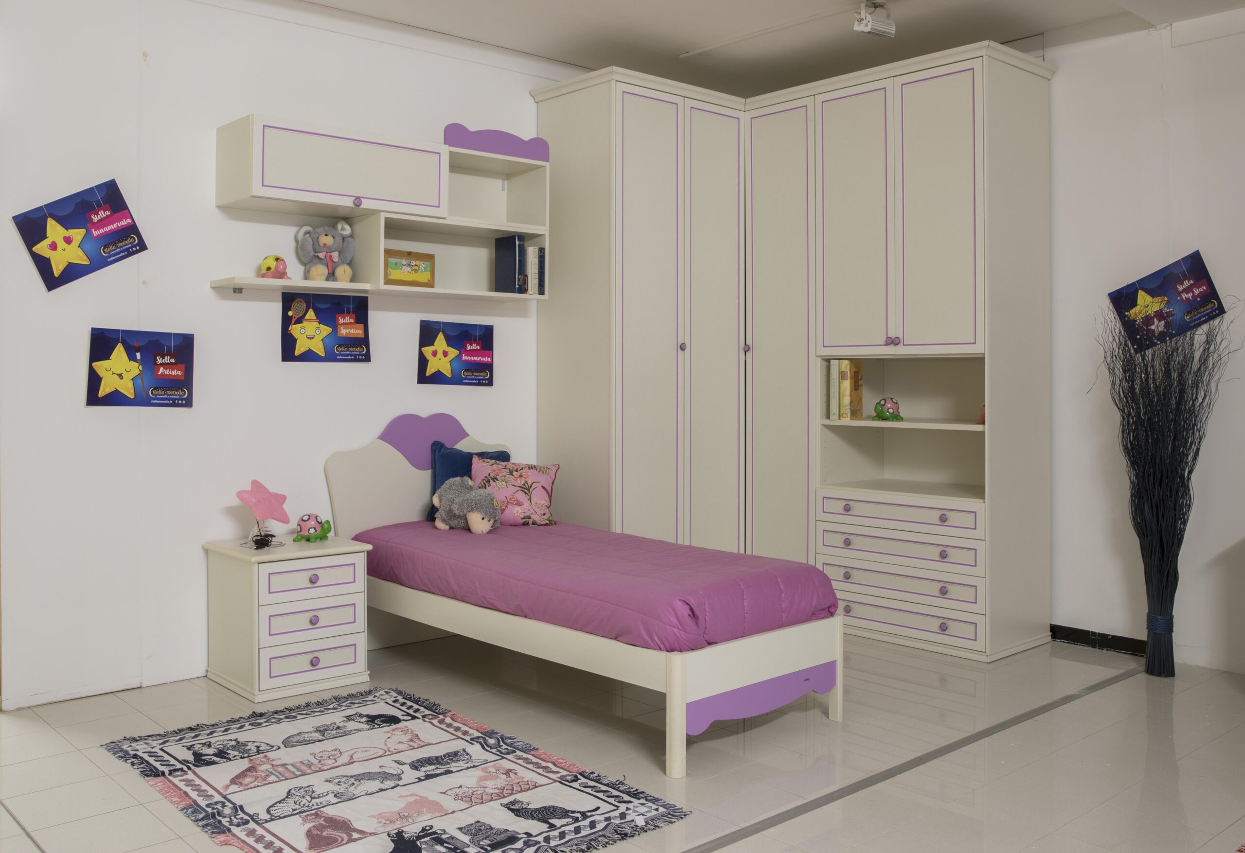 Cameretta composta da: Armadio angolo letto, comodino, mensole e scrittoio finitura patinata e lilla.