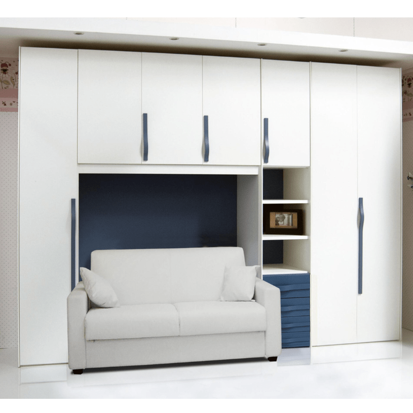 Armadio a Ponte finitura bianco frassino e maniglie e cassetti blu opaco.