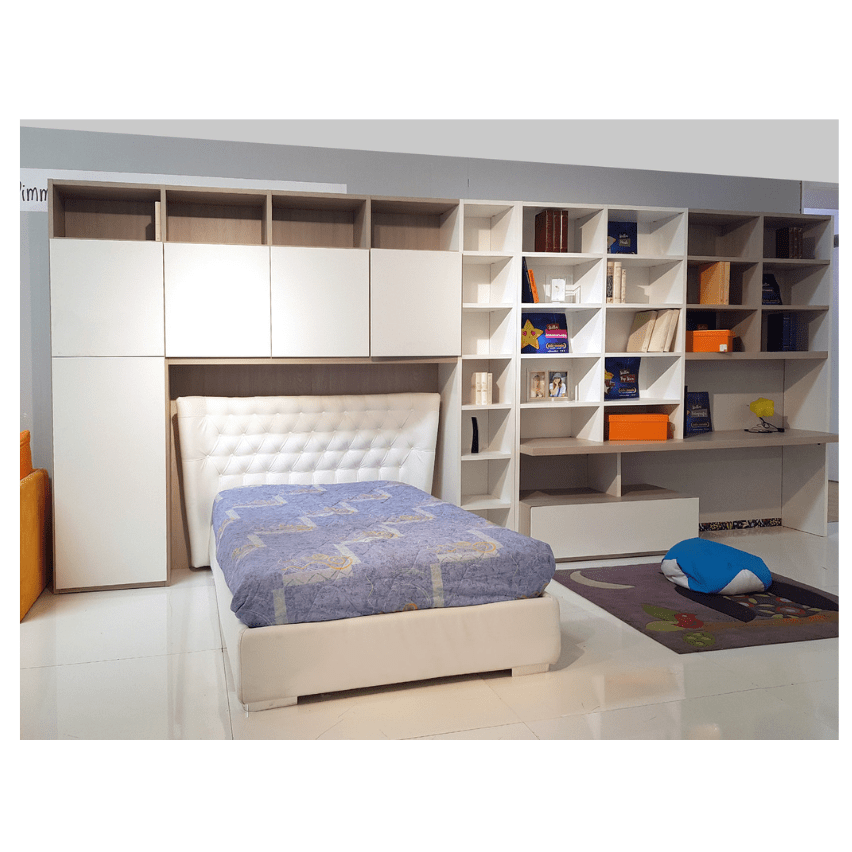 Difetti: Ripiano interno superiore dell’ armadio 2 ante rovinato, la Testata del letto presenta una ammaccatura, schienale interno armadio ad angolo rovinato, ripiano interno inferiore dell’armadio ad angolo rovinato, zoccolo e cornici con ammaccature agli angoli.