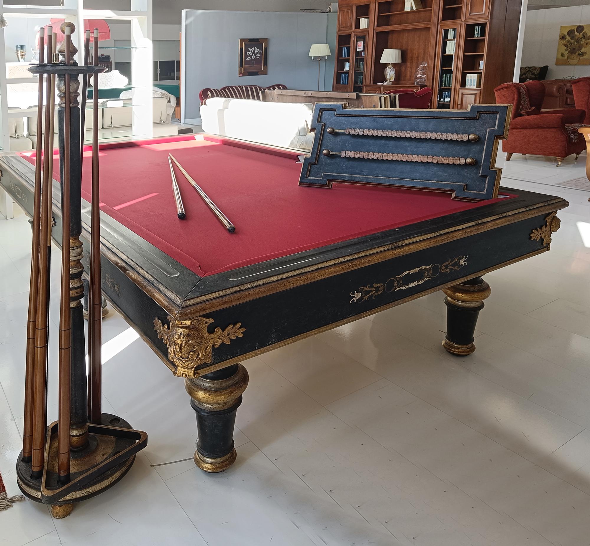 Biliardo antico – completo di 10 stecche, portastecche, tringolo, segnapunti in legno coordinato.
