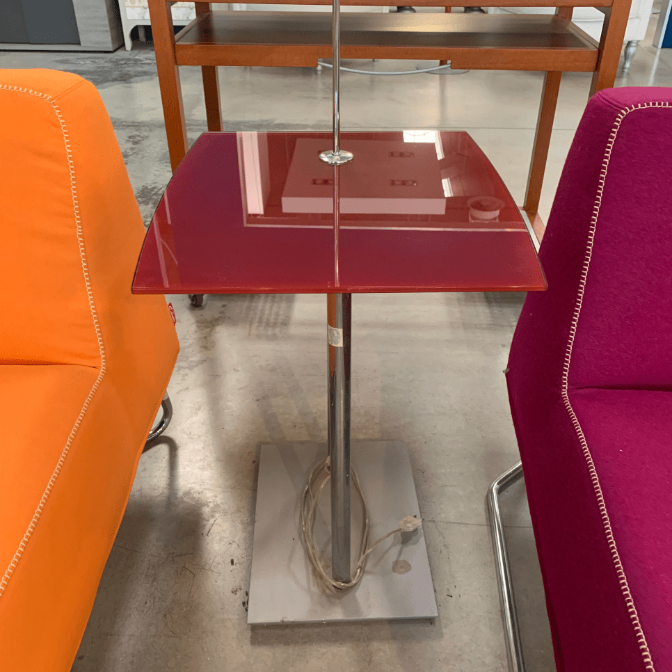 Tavolino con base in vetro e lampada integrata.