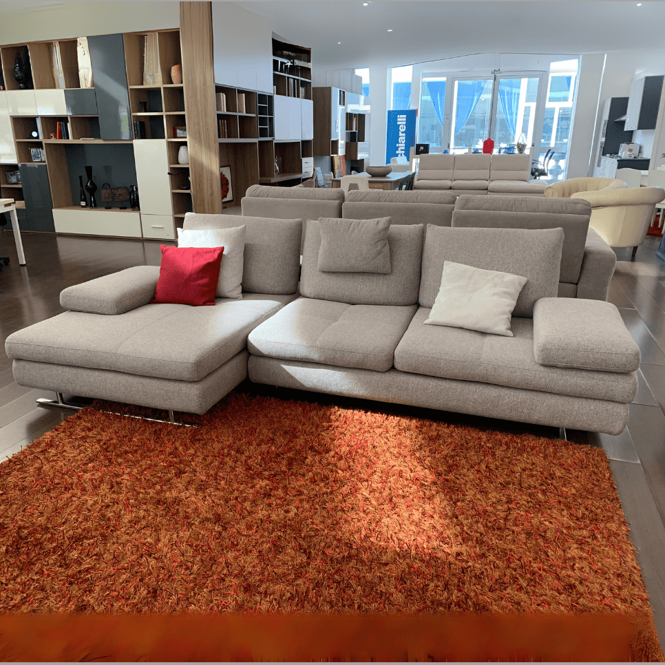 Divano con chaise longue, braccioli estensibili e schienali traslanti.