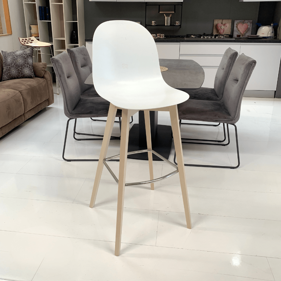 Sgabello Accademy con base faggio e seduta di colore bianco.