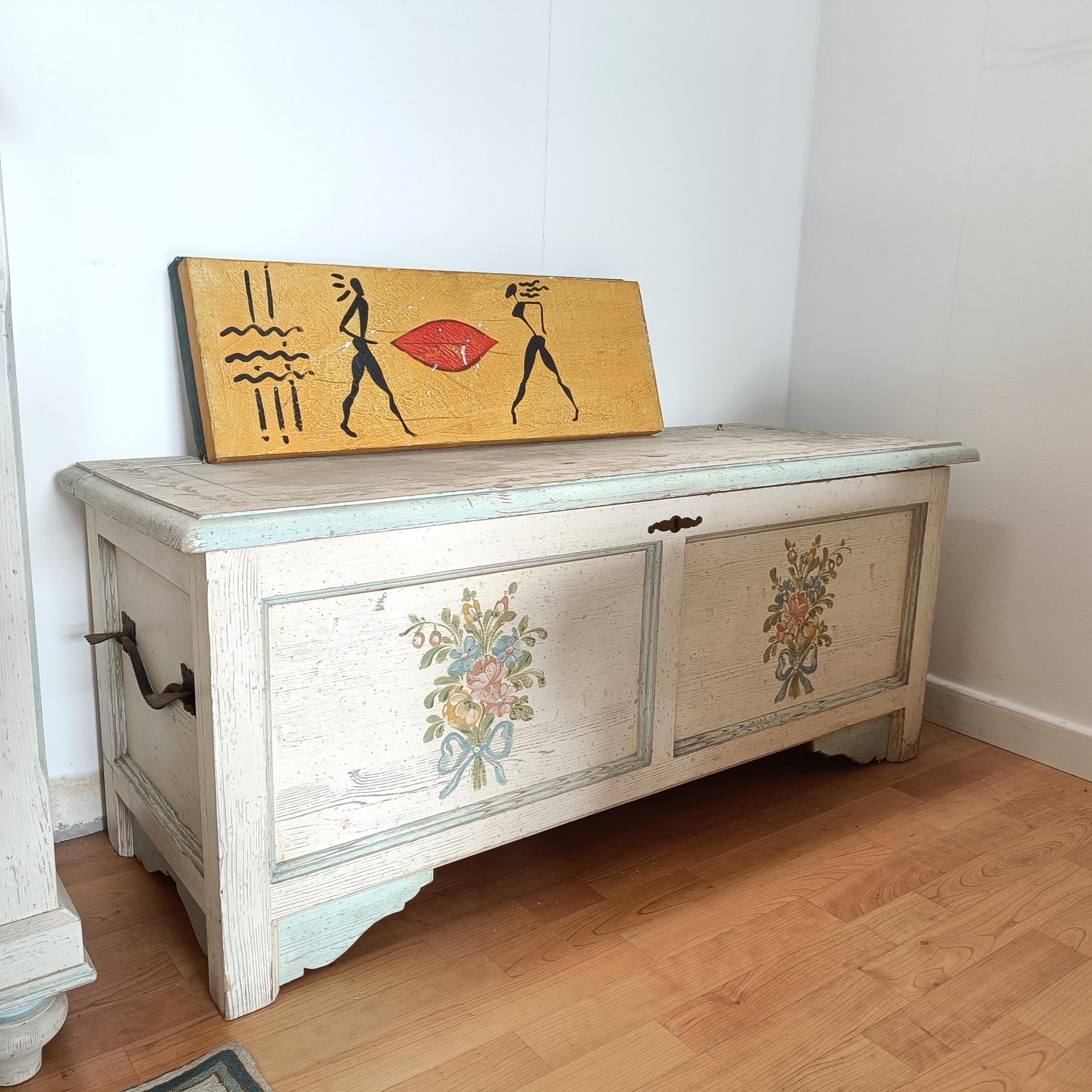 Cassapanca in legno massello con decori.