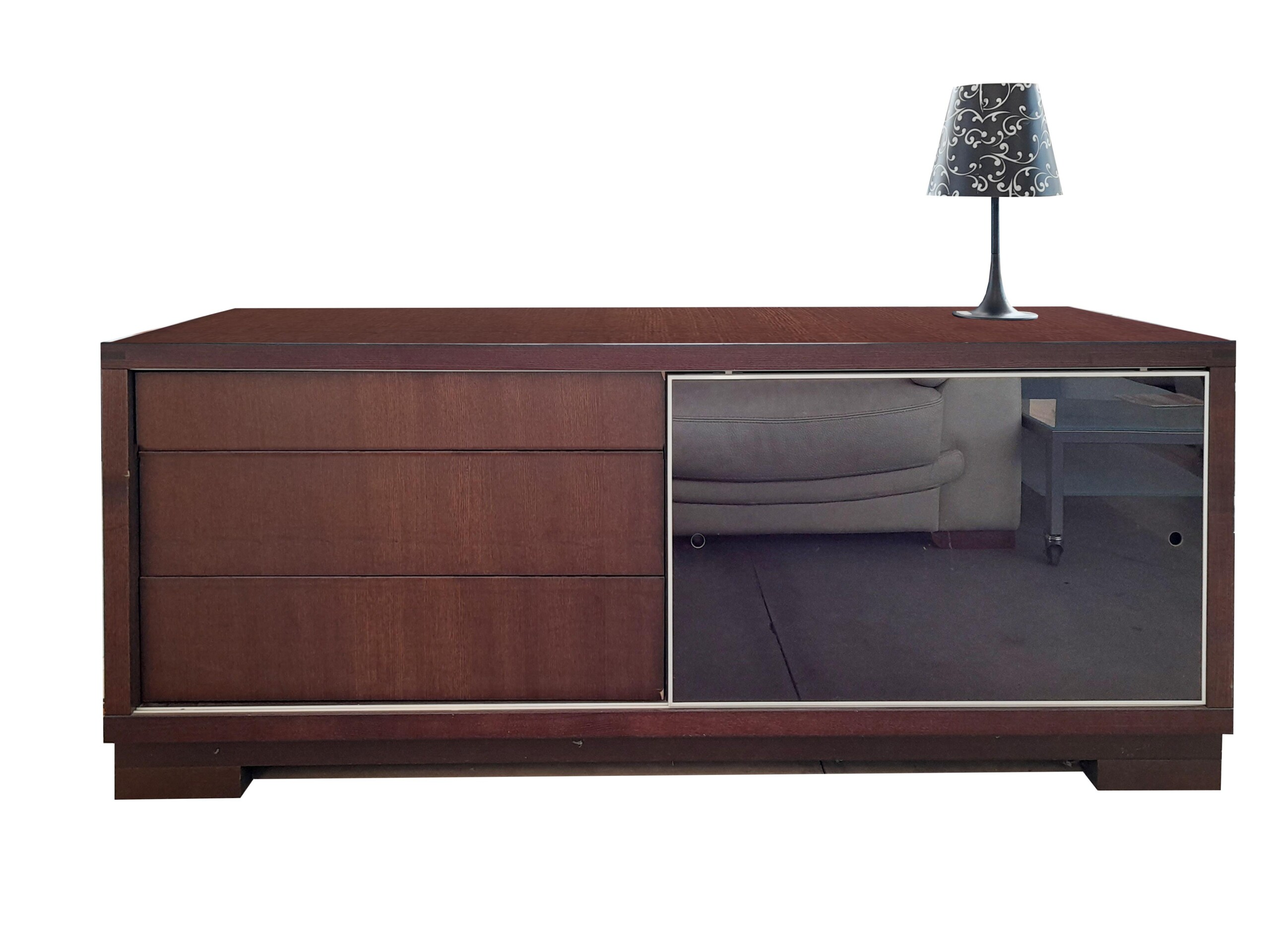 Madia Calligaris in finitura noce scuro con anta vetro colore testa di moro con apertura scorrevole.