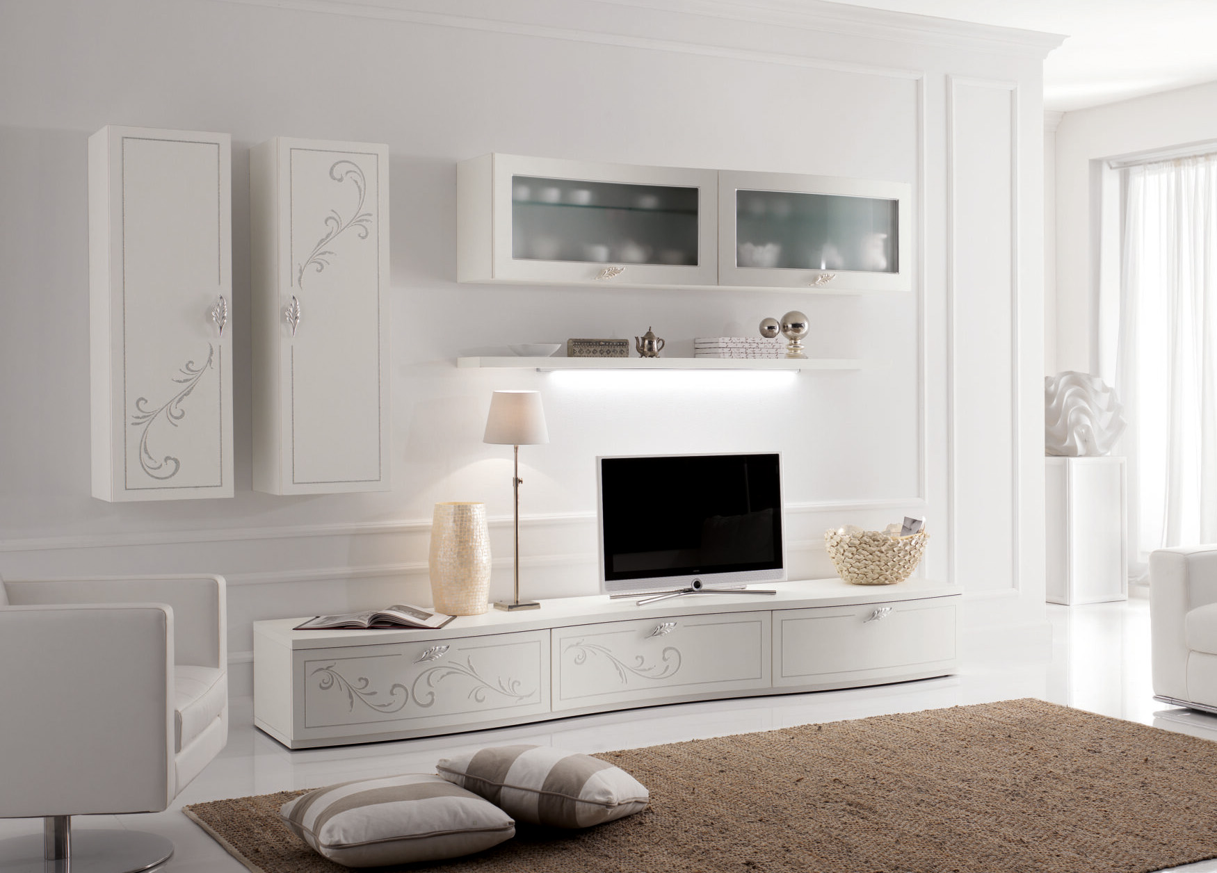 Parete attrezzata contemporanea, struttura e frontali finitura bianco frassinata con partixolari e maniglie argento.