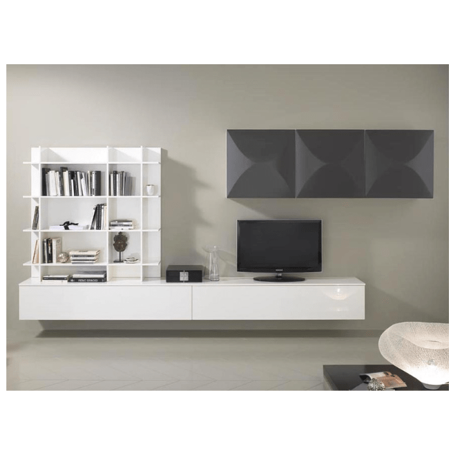struttura bianco lucida e e frontali laccati bianco lucido, con frontali pensili, con lavorazione a diamante, laccati piombo lucido