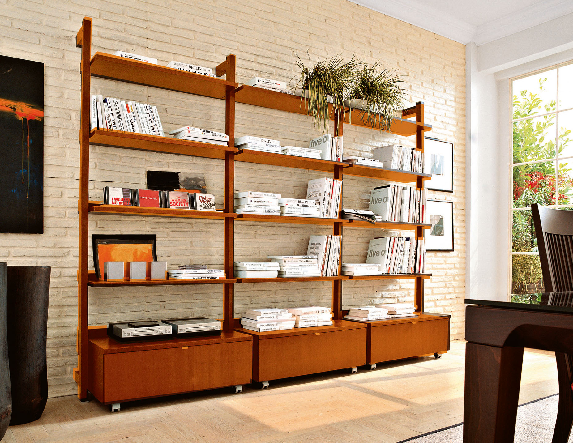 Parete Libreria in finitura ciliegio, ripiani in vetro trasparente.