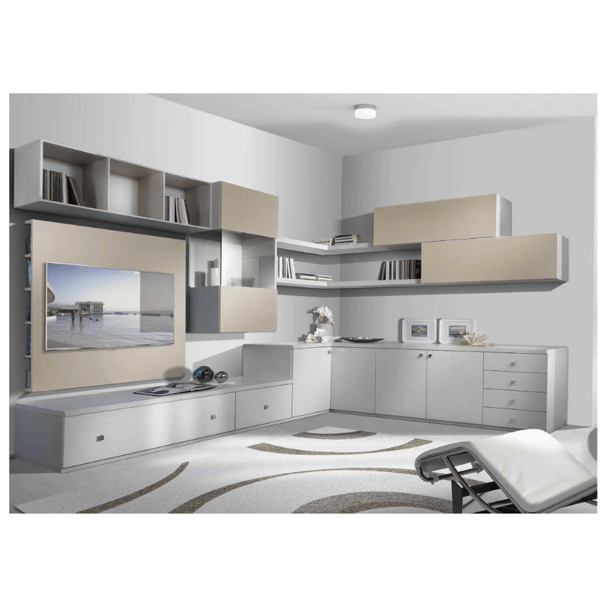 Soggiorno ad angolo finitura betulla con frontali in betulla e laccati tortora.