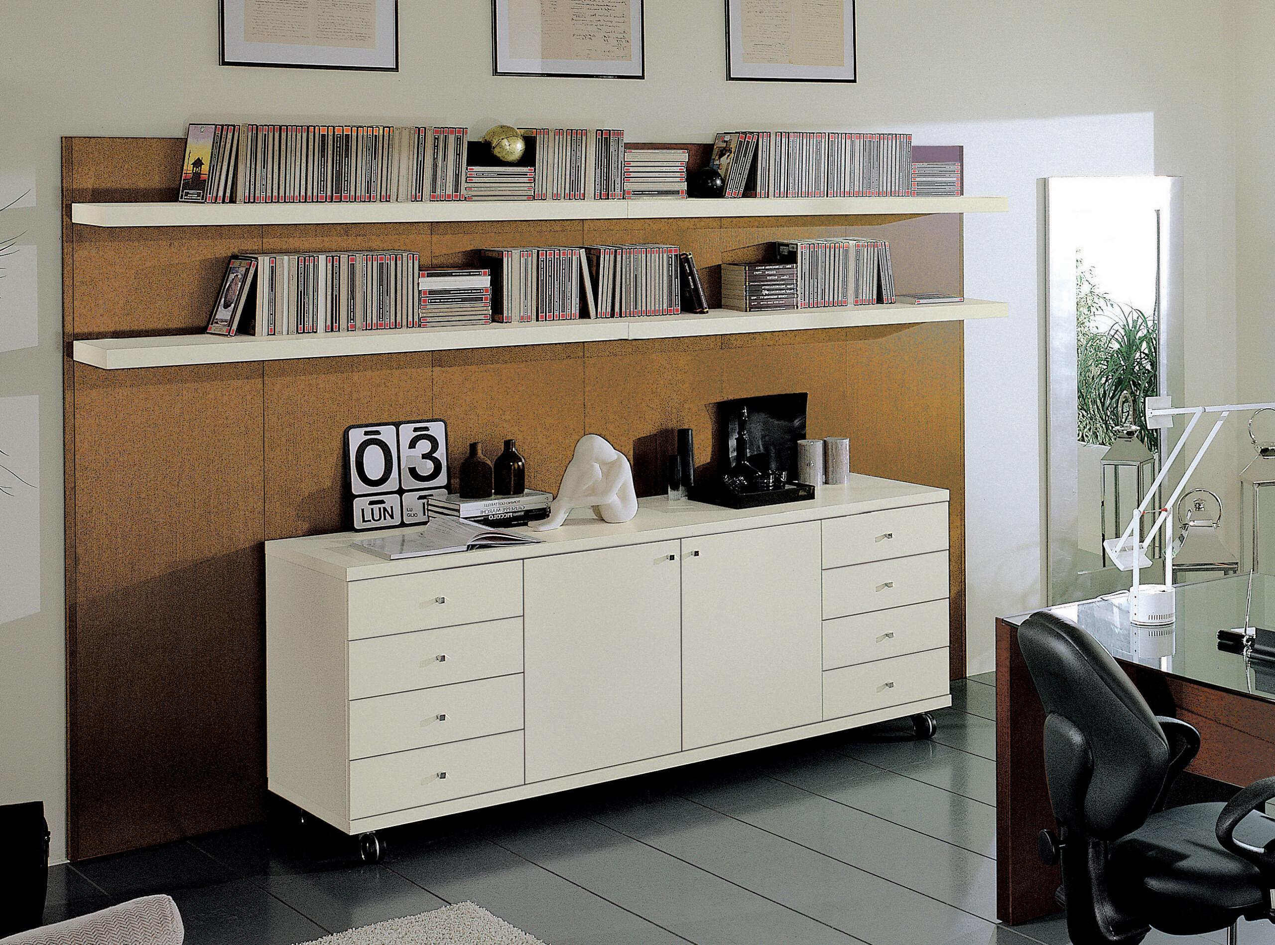 Parete ufficio completa di boiserie finitura Ciliegio, con madia laccata bianco opaco.