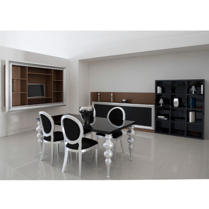 Finitura noce medio e laccato nero lucido con particolari argento.
