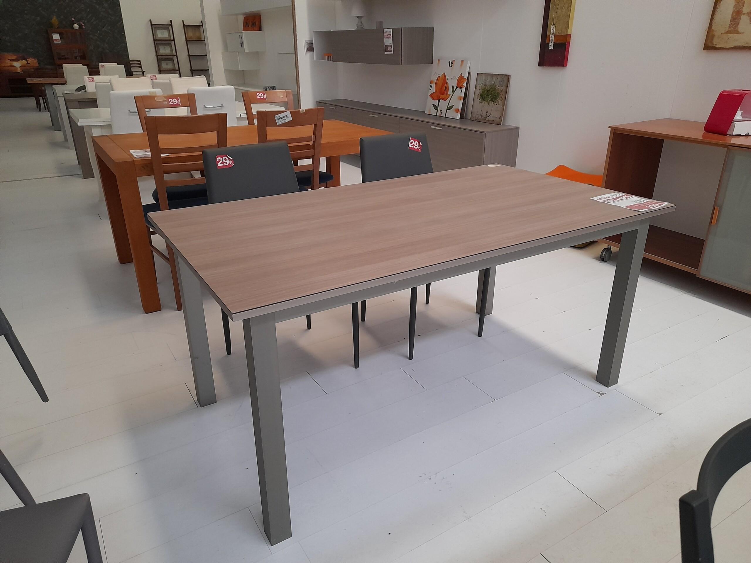 Tavolo rettangolare fisso in metallo colore tortora, piano finitura noce medio.