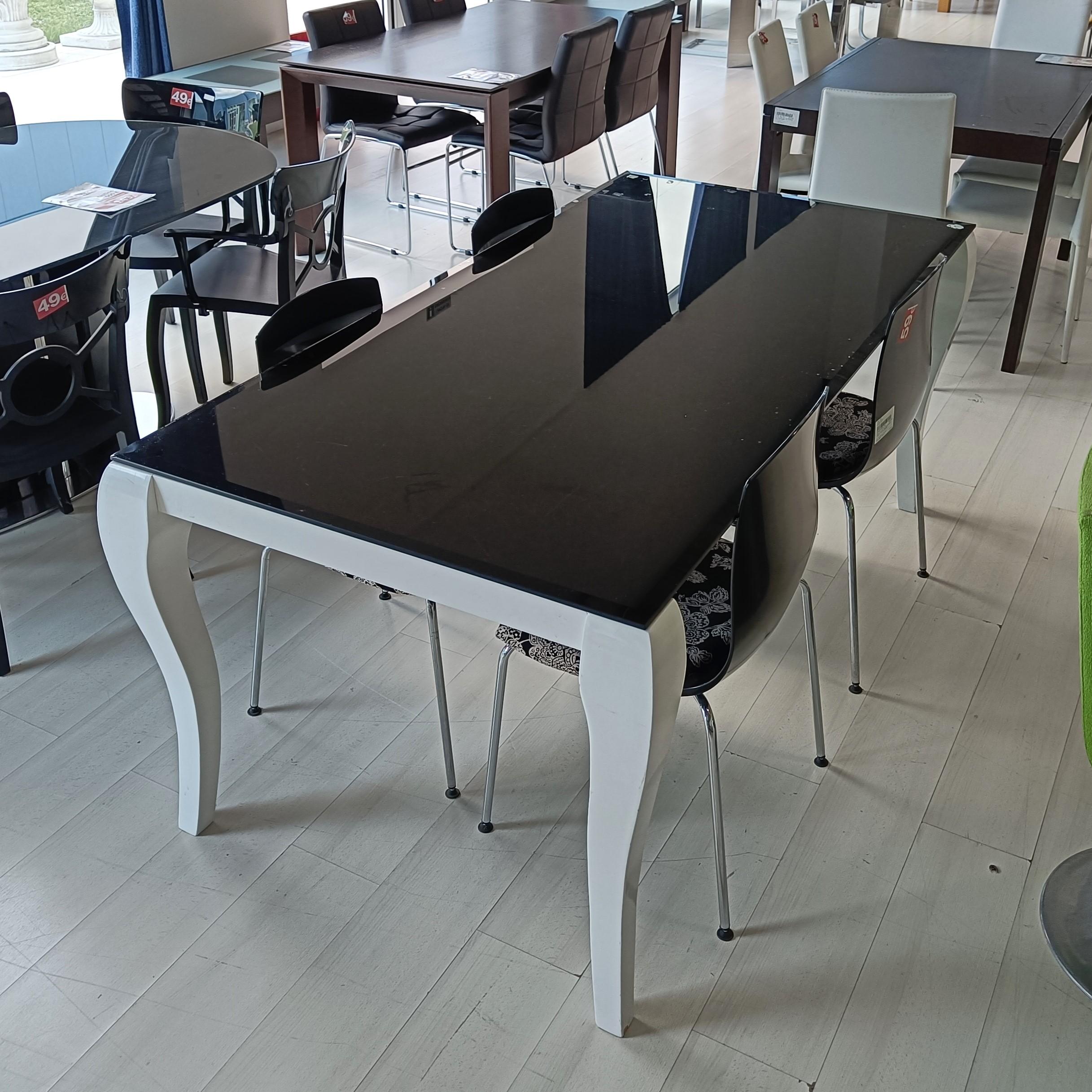Tavolo con struttura bianca e piano in vetro nero temperato.
