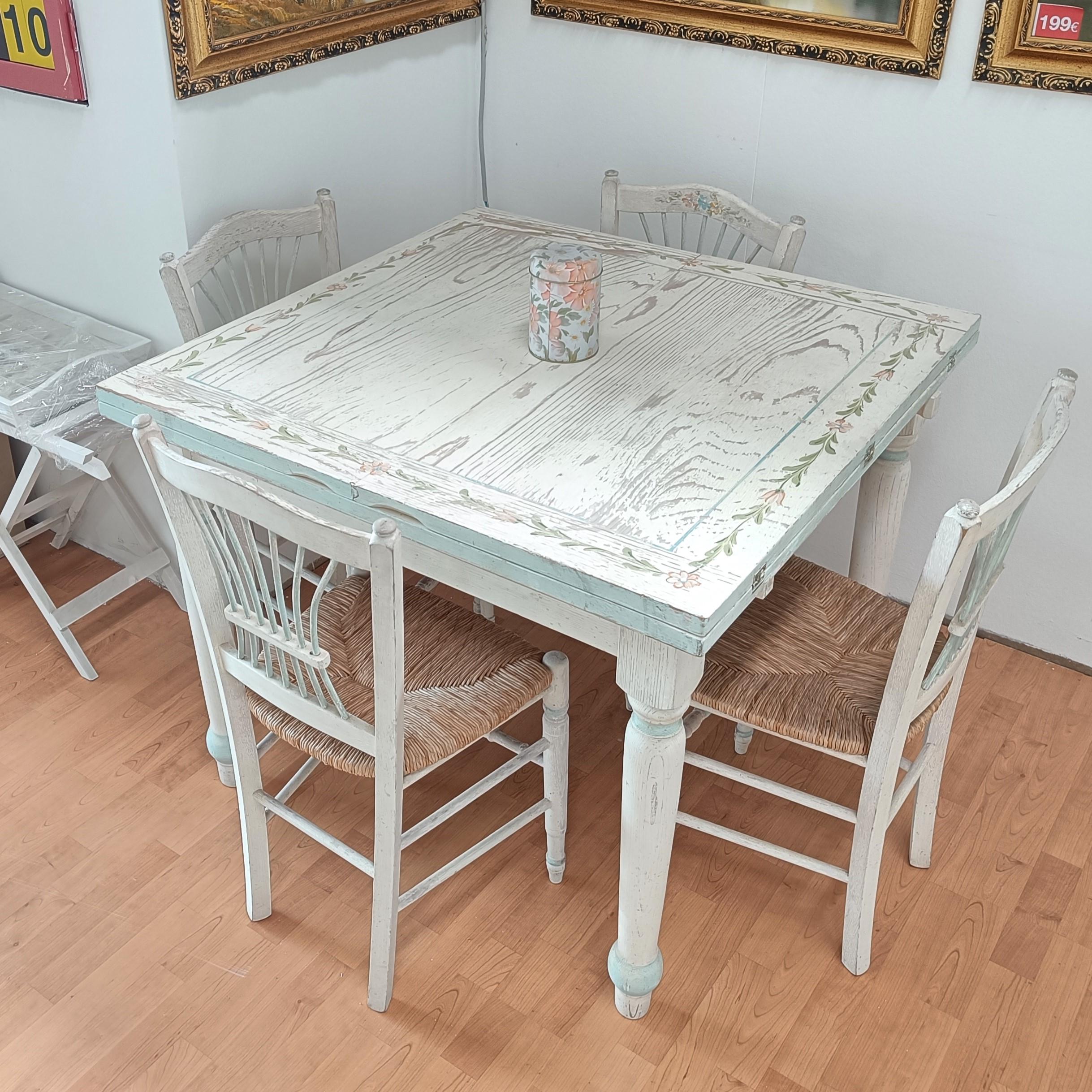 Tavolo allungabile +4 sedie in legno massello, con decori.