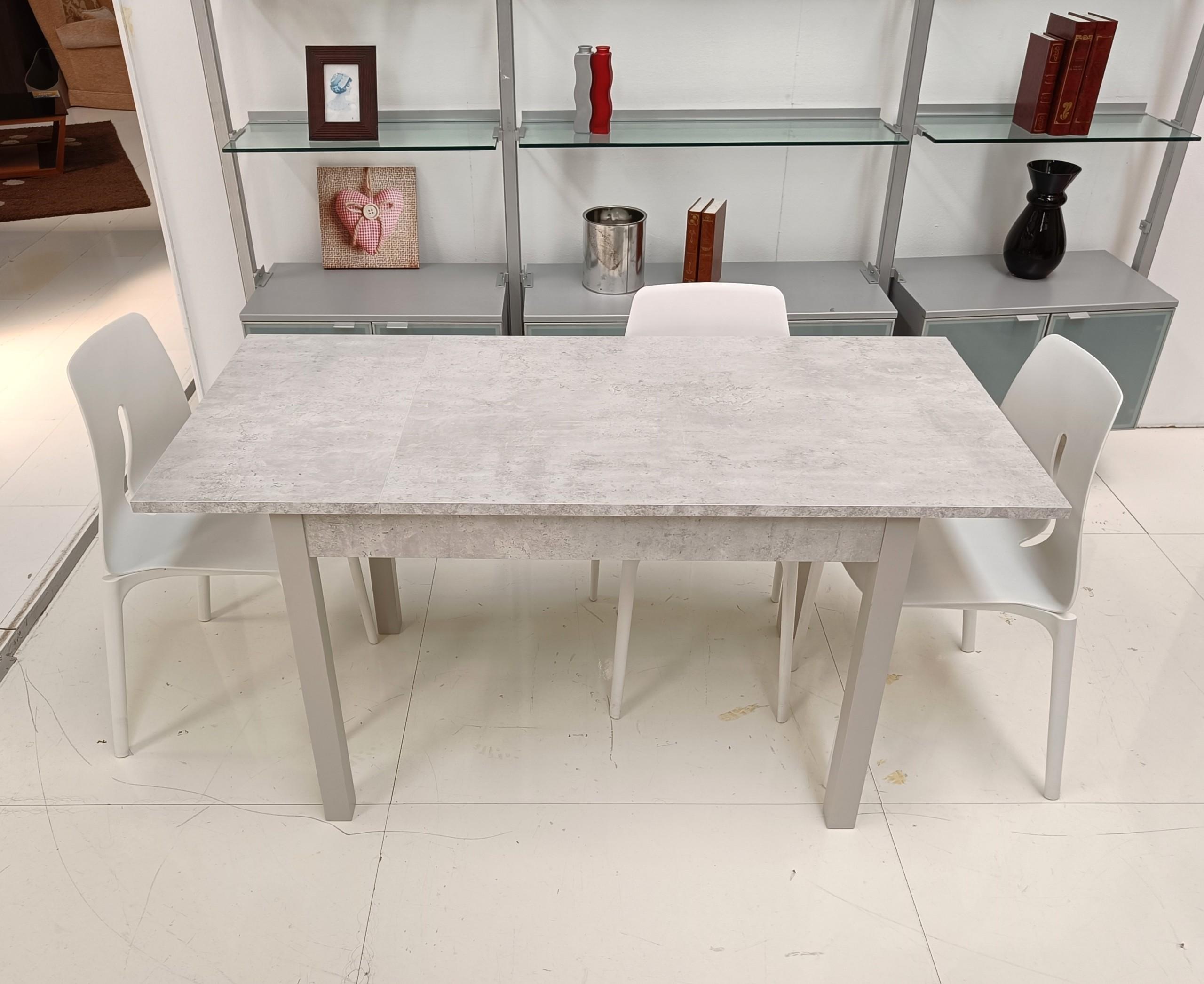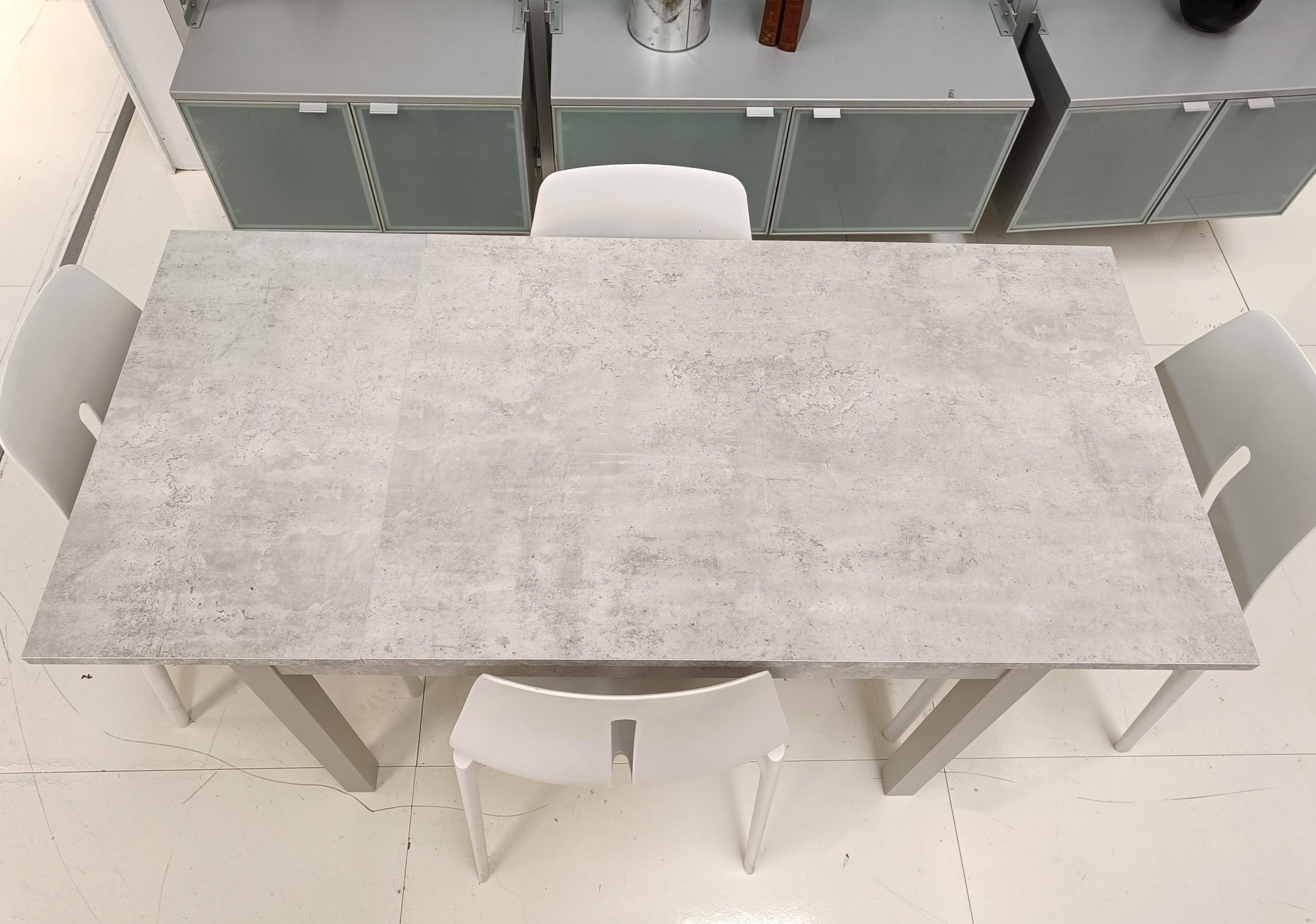 Tavolo rettangolare, allungabile, bianco con effetto cemento.